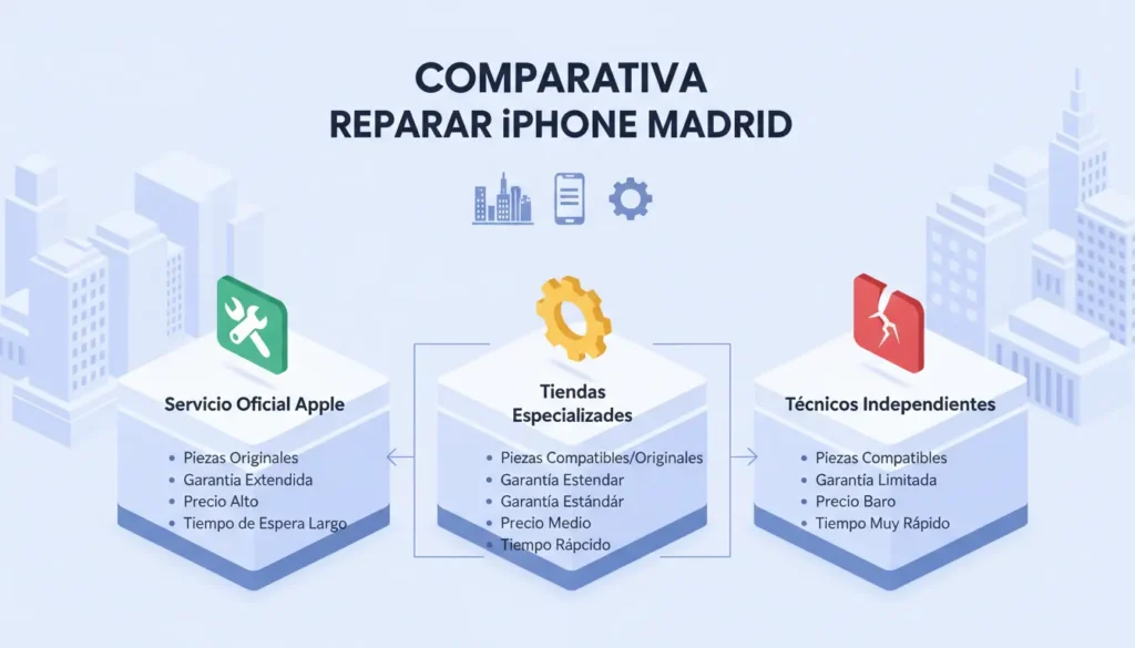 Aquí es donde muchos usuarios cometen errores costosos. Tienes tres opciones principales al buscar «reparar móvil iPhone»: