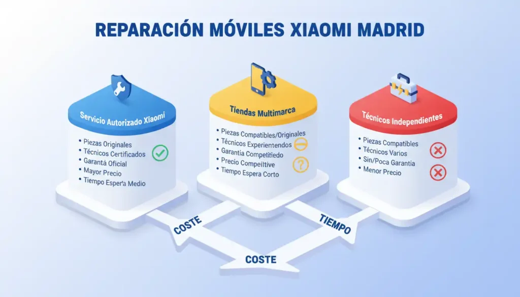 Si tu Xiaomi está en garantía oficial y el daño está cubierto (defectos de fábrica), acude al Servicio Técnico Oficial Xiaomi o centro autorizado. Golpes, humedad o desgaste natural no entran en garantía. Para reparaciones fuera de garantía, talleres especializados como el nuestro ofrecen precios con repuestos originales o compatibles premium.